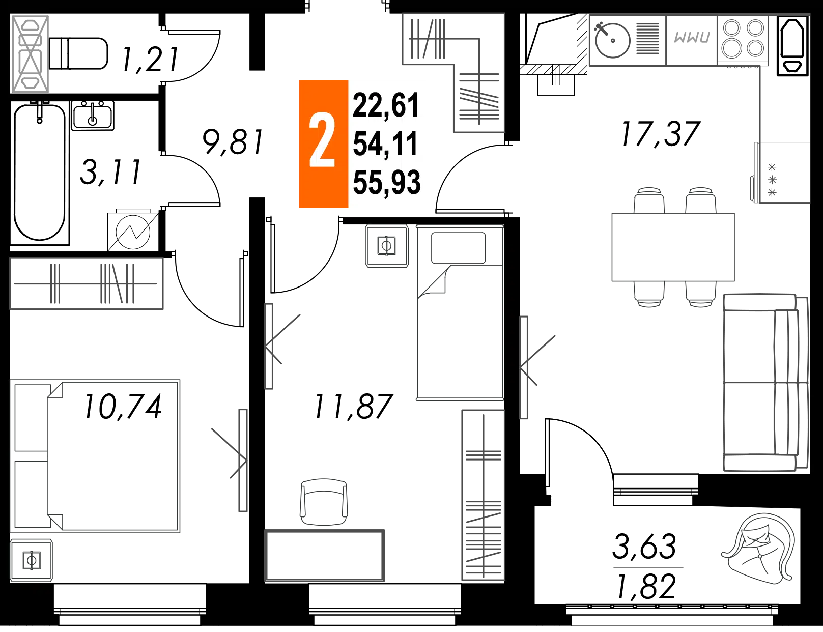 2-комнатная, 56.12 м²