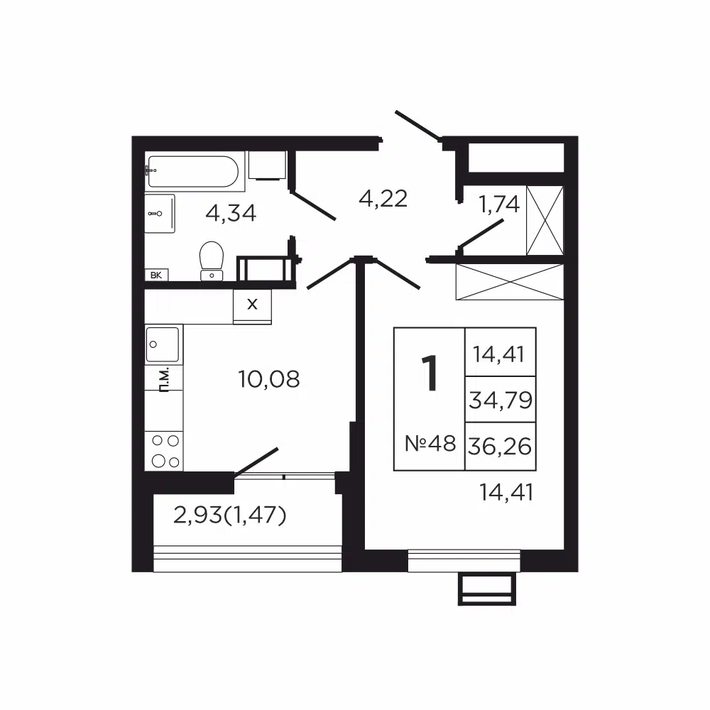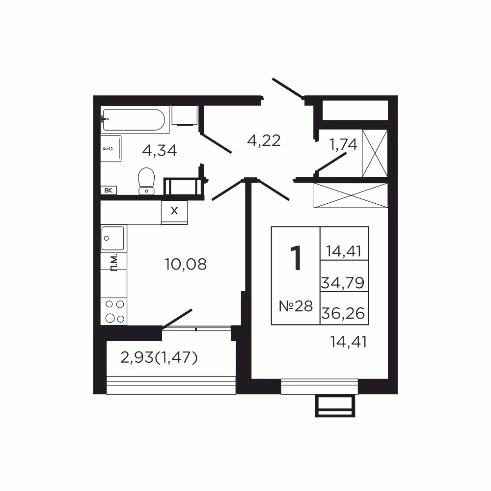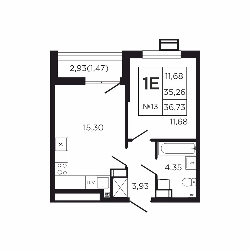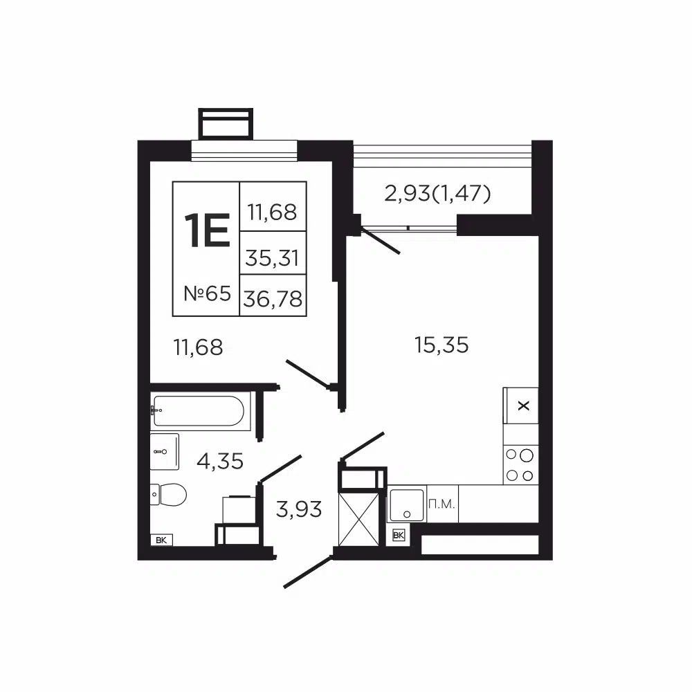 1-комнатная, 39.27 м²