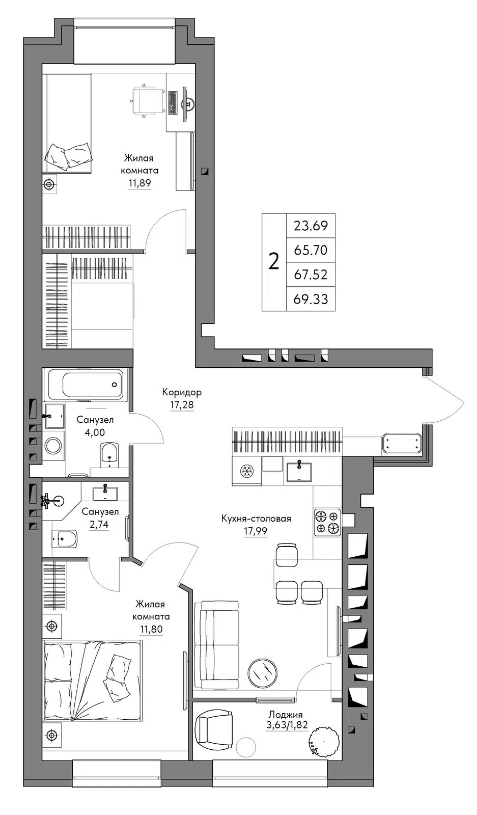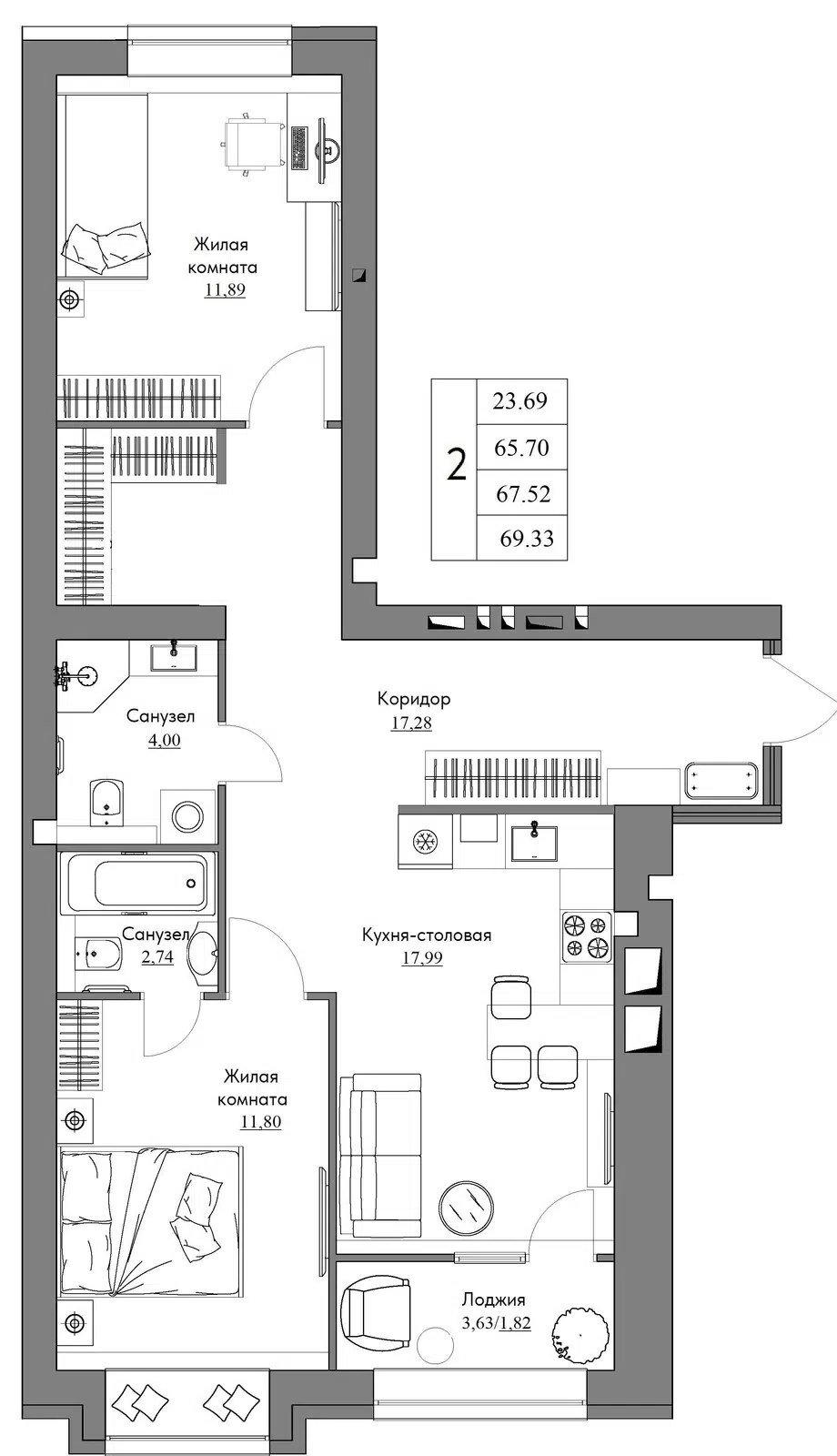 2-комнатная, 70.47 м²