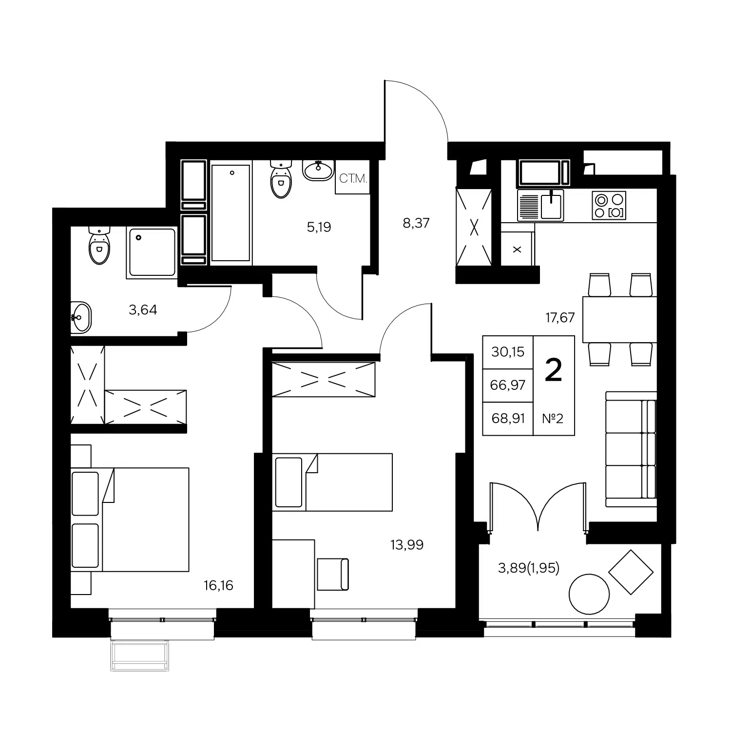 2-комнатная, 68.91 м²